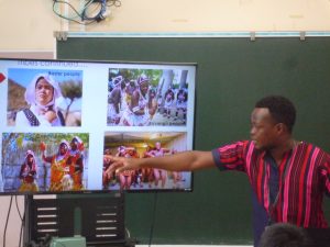 講座の前半は、画像を見ながらナミビアの概要についてお話を聞きました。ナミビアはアフリカの南西部にある国で、西は大西洋に面しており、北にアンゴラ、北東にザンビア、東にボツワナ、南に南アフリカ共和国と国境を接しています。首都はウィントフックで、30の部族が暮らしているそうです。そして、ナミビアには世界最古の砂漠-ナミブ砂漠があることや、ゾウ・ライオン・シマウマなどたくさんの野生動物が生息していますが、その中でもチーターの生息数が世界一だというお話を聞きました。