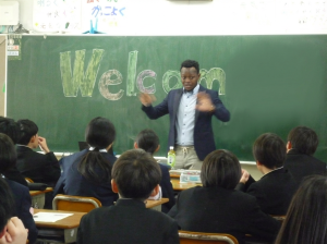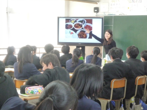 「今回は、1クラスに1人で4クラス4人の留学生に来ていただきましたが、どの方も笑顔でにこやかに、パワーポイントを使い自国の文化、言葉や食事、有名な観光地などを日本語で一生懸命に紹介してくださいました。クイズ形式で紹介したり、一緒に歌を歌ったり、ゲームをしたり、大変盛り上がっていました。英語の授業で学習したことが出てきたようでそれも勉強になったようでした。話が終わると生徒から質問が出ましたが、1つ1つ丁寧に答えてくださり、終わった後も控室の前に生徒たちが集まり、もっと交流したいようでした。出前講座の数日後でもナミビアの歌を歌っている生徒がいて、とても印象に残っているのだと感じました。お礼のメッセージカードにも教えてもらった留学生の方のお国の言葉でメッセージを書いている生徒がいました。生徒たちにとって、他国のことを知ることで、お互いを知ることの大切さや、自分たちが当たり前に与えられていることの大切さに気付くきっかけとなりましたし、自分の国である日本にも目を向けるきっかけにもなりました。とても貴重な体験をさせていただき、ありがとうございました。直接コミュニケーションをとることの大切さを改めて感じました。」