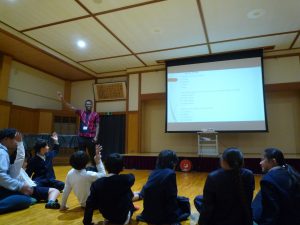 奈良教育大学で学ぶヒテワ・パウルス・ンディリシャンジュさんが、月ヶ瀬小学校1~6年生の46人に、出身国のナミビアについての紹介をしてくれました。