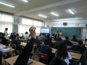 ルイス・アンジェリナさんからの質問に手を挙げて答える生徒たち